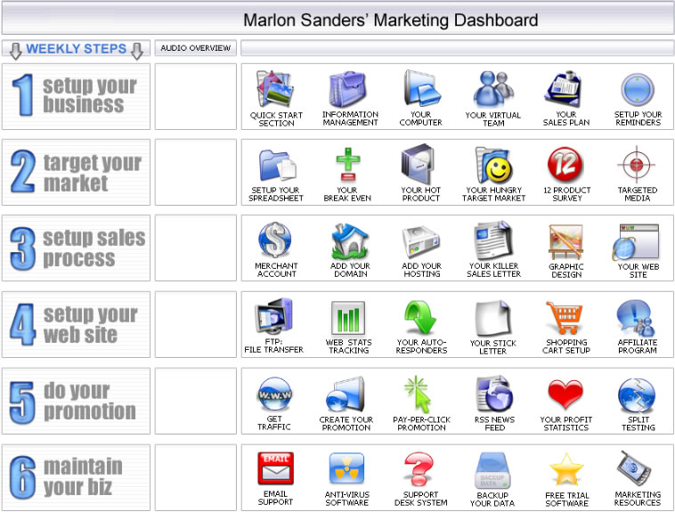My Marketing Dashboard is designed for beginners. But I've included steps for advanced students like the icons on getting free publicity by starting your own RSS News Feed, setting up your own blog and getting your own affiliate program created.